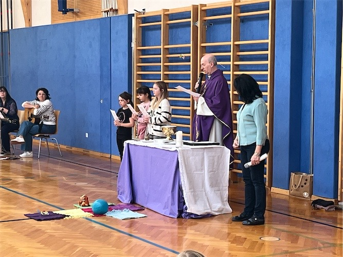 Kurz vor Weihnachten wurde der Weihnachtsgottesdienst im Turnsaal gefeiert. Einige Kinder trugen Texte und Lieder vor und alle Kinder sangen eifrig mit. Mehr Fotos in der Fotoagalerie.